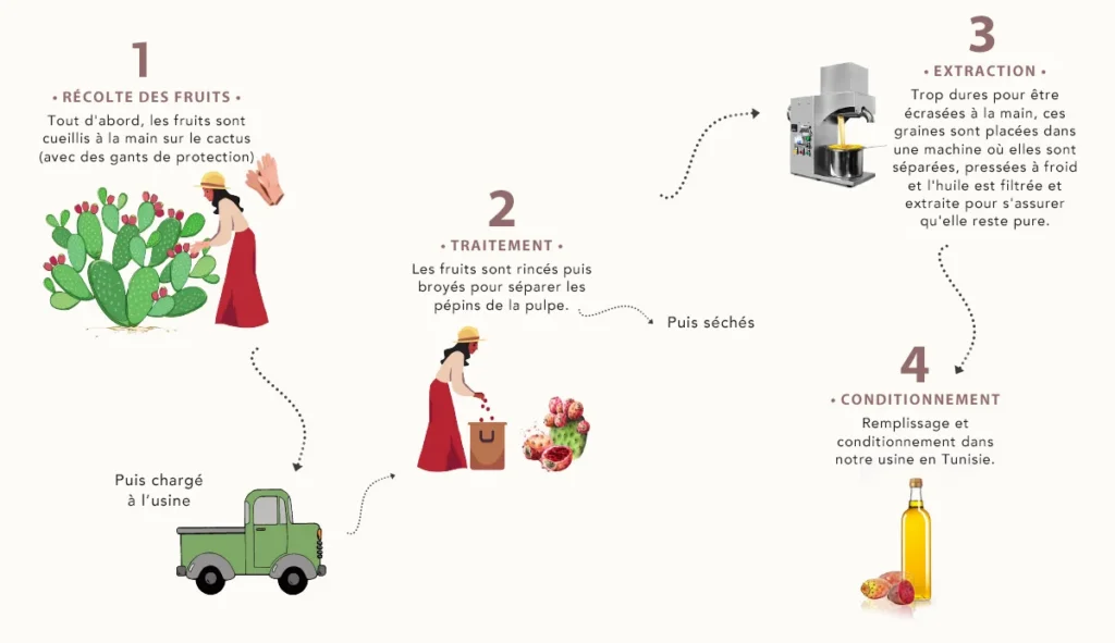 Beaucoup plus efficace et recherchée que l’huile d’argan, l’huile de pépins de figue de barbarie est aussi beaucoup plus onéreuse. En effet, elle est cultivée dans des conditions climatiques extrêmes et son extraction est rare. Aussi, il faut une tonne de figues pour extraire un litre d’huile (dont le prix équivaut approximativement à 1000$) !